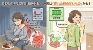 実は、いくらマッサージに行っても取れない背中や肩の張りは、その「甘いもの」が原因のサインかもしれません。今回は、私たちの体を「スマートフォン」に例えて分かりやすく解説します!