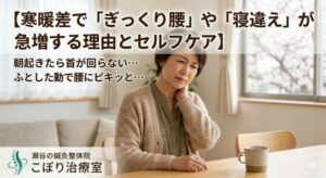最近、「朝起きたら首が痛くて回らない」「靴下を履こうとしたら腰に激痛が…」といった、ぎっくり腰や寝違えでお悩みの方が急増しています。