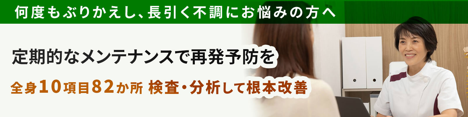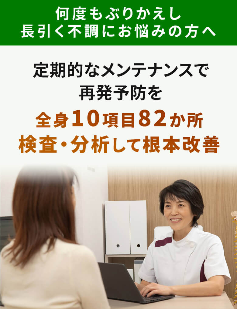 当院では、あなたが不調に気がつく前の、未病の段階でメンテナンスをすることで、からだの不調に悩まされることなく、何歳になっても健康で過ごせる身体の維持・向上のお手伝いを行います。
