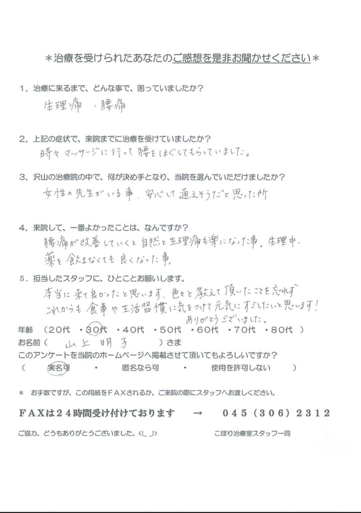 生理痛と、腰痛で困っていました。女性の先生がいるので安心して通えそうだと思い、通院を決めました。これからも食事や生活習慣に気を付けて元気に過ごしたいと思います!