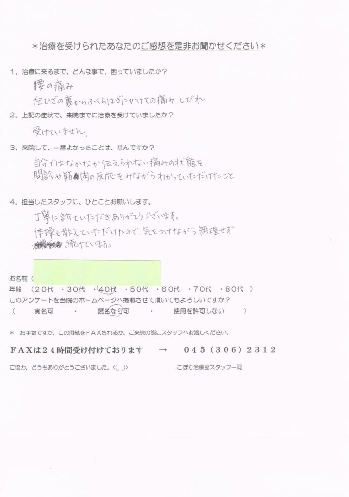 腰の痛みを、問診や筋肉の反応を見ながら解っていただけました。丁寧に見ていただきありがとうございます。